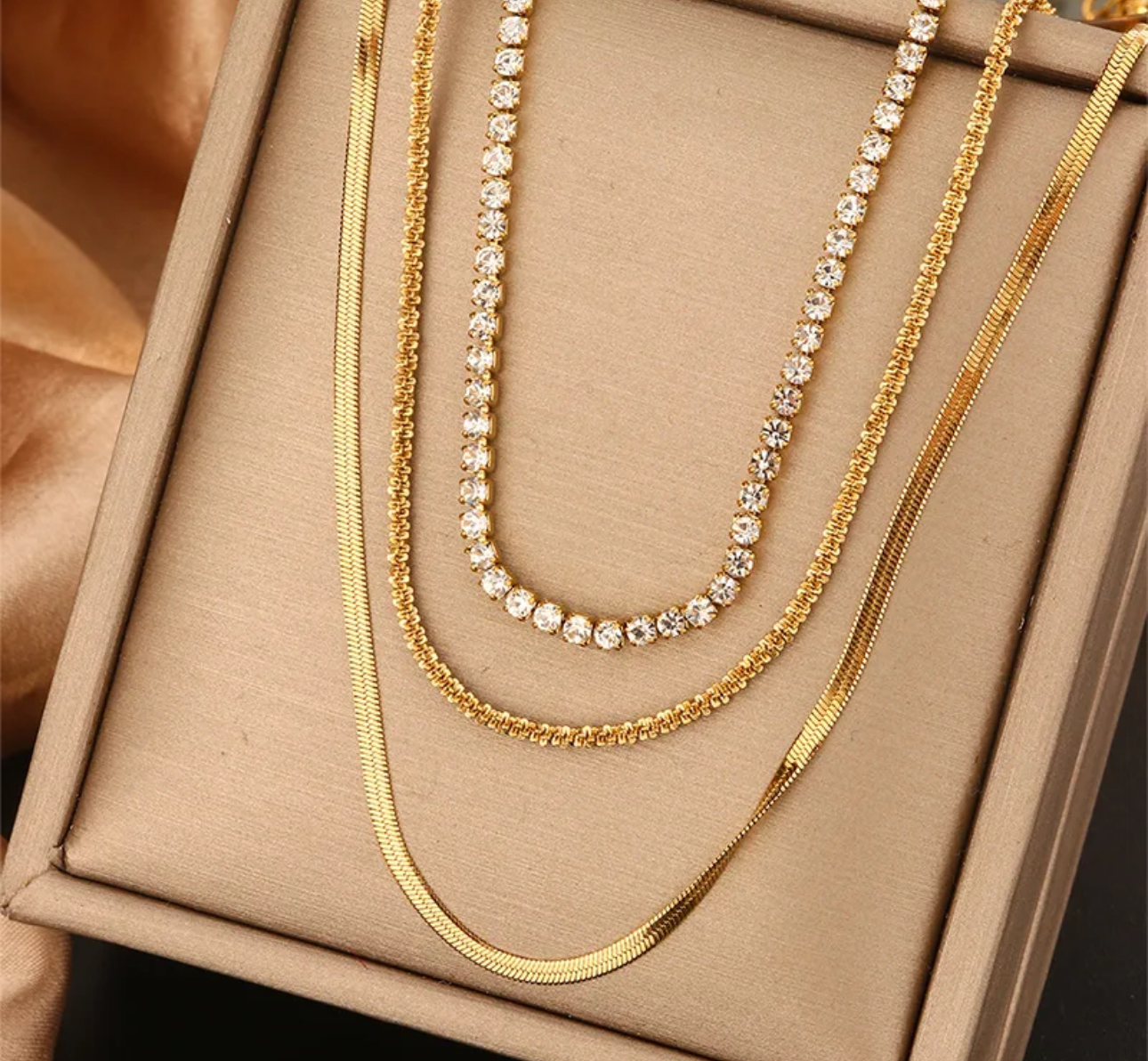 Ατσάλινο αδιάβροχο και υποαλλεργικο τριπλό κολιέ επιχρυσωμένο 18 κ και μια σειρά από κρύσταλλα ζιργκον